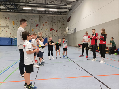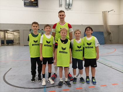 Hier haben von der Abteilung Vincent, Felix, Tobias, Daniela und Vicky die Kinder bei den ersten Schritten im Handball unterstützt.